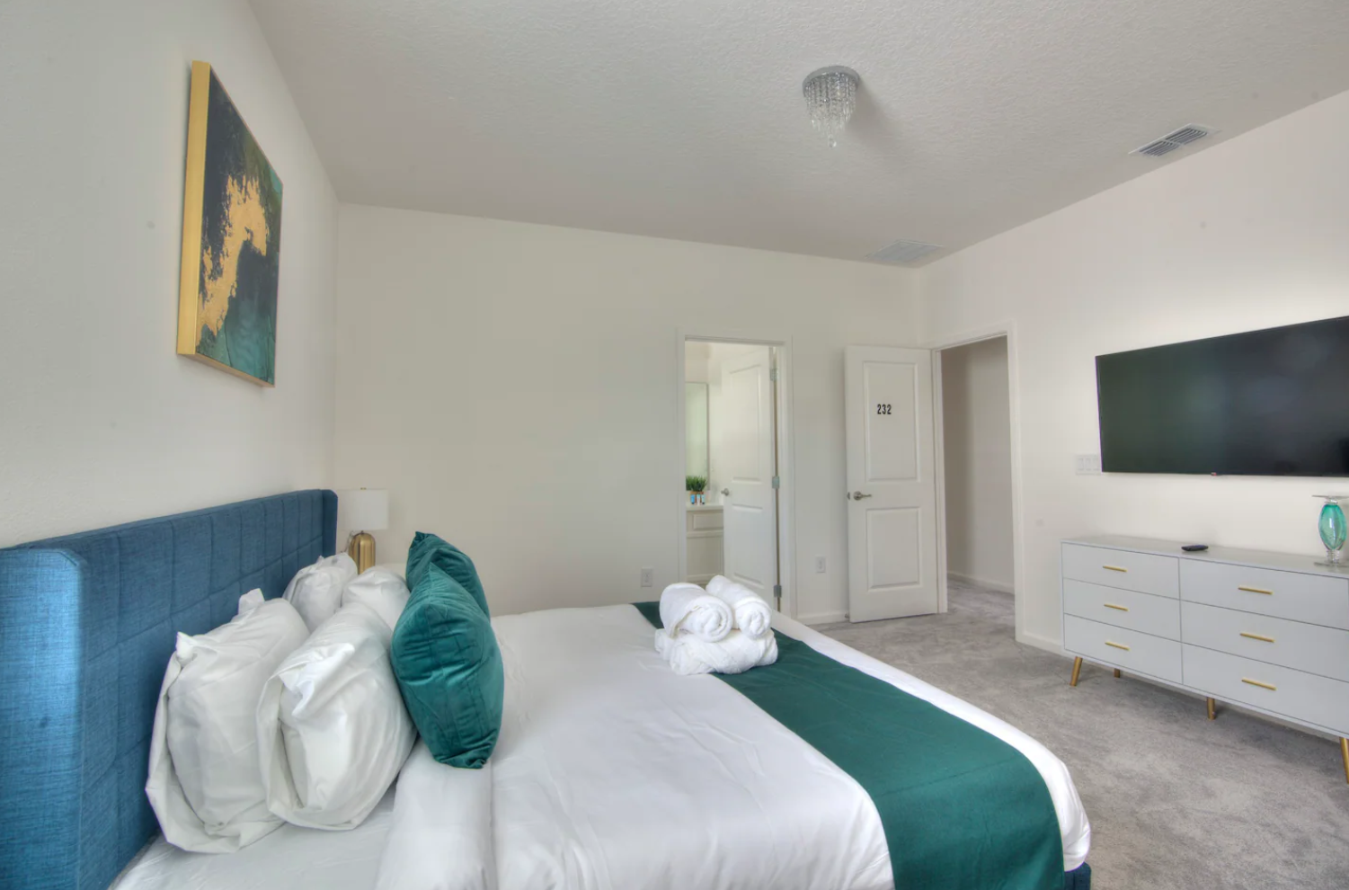 Experience warmth of a vibrant resort in the heart of Kissimmee! - King bedroom with 1 king bed - Private bathroom with bathtub - Smart 50" Roku TV & wardrobe - Outdoor patio & swimming pool - Shared kitchen, dining, laundry & game room - 17 min to Disney & 25 min to Universal Studios - Travel to parks by Uber, rented car & public bus - Free access to pool & gym at the clubhouse - Self-check-in between 4 pm to 2am - Early check-in may be available from 12 pm for a fee - Discounts for long-term stays available - Free House parking