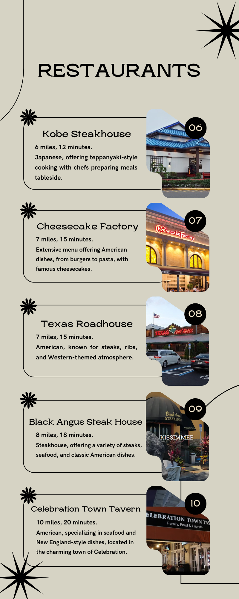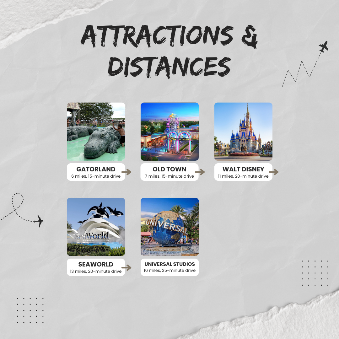 Get AroundParking is easy in the area, with free parking at several shopping malls. Walt Disney World is the main attraction! Supermarkets and shopping locations are also just a few minutes drive away from the house such as the Walmart Supercenter, Wawa, ALDI Food Market, Target, Plaza Del Sol, Publix Food & Pharmacy, and Kissimmee Valley Livestock Shows Pavilion. There are also restaurants and bars accessible within 5 minutes to less than 20 minutes drive such as the Fish Taco Kissimmee, La Granja Kissimmee, Kabayan Grill Filipino Restaurant, Paul's Italian Deli and Restaurant, Abracadabra Ice Cream Factory, The Italian Joint, Buchito Cuban Style Breakfast, Pa' Paraguaná Venezuelan Latin Restaurant, Big John's Rockin' BBQ, Sazón Latino Mexican Restaurant, Kobé Japanese Steakhouse, Flippers Pizzeria, Miller's Ale House, Olive Garden, Chuy's, Bahama Breeze, Kobe Steakhouse, Cheesecake factory, Texas Roadhouse, Black Angus Steak House and Celebration Town Tavern!
