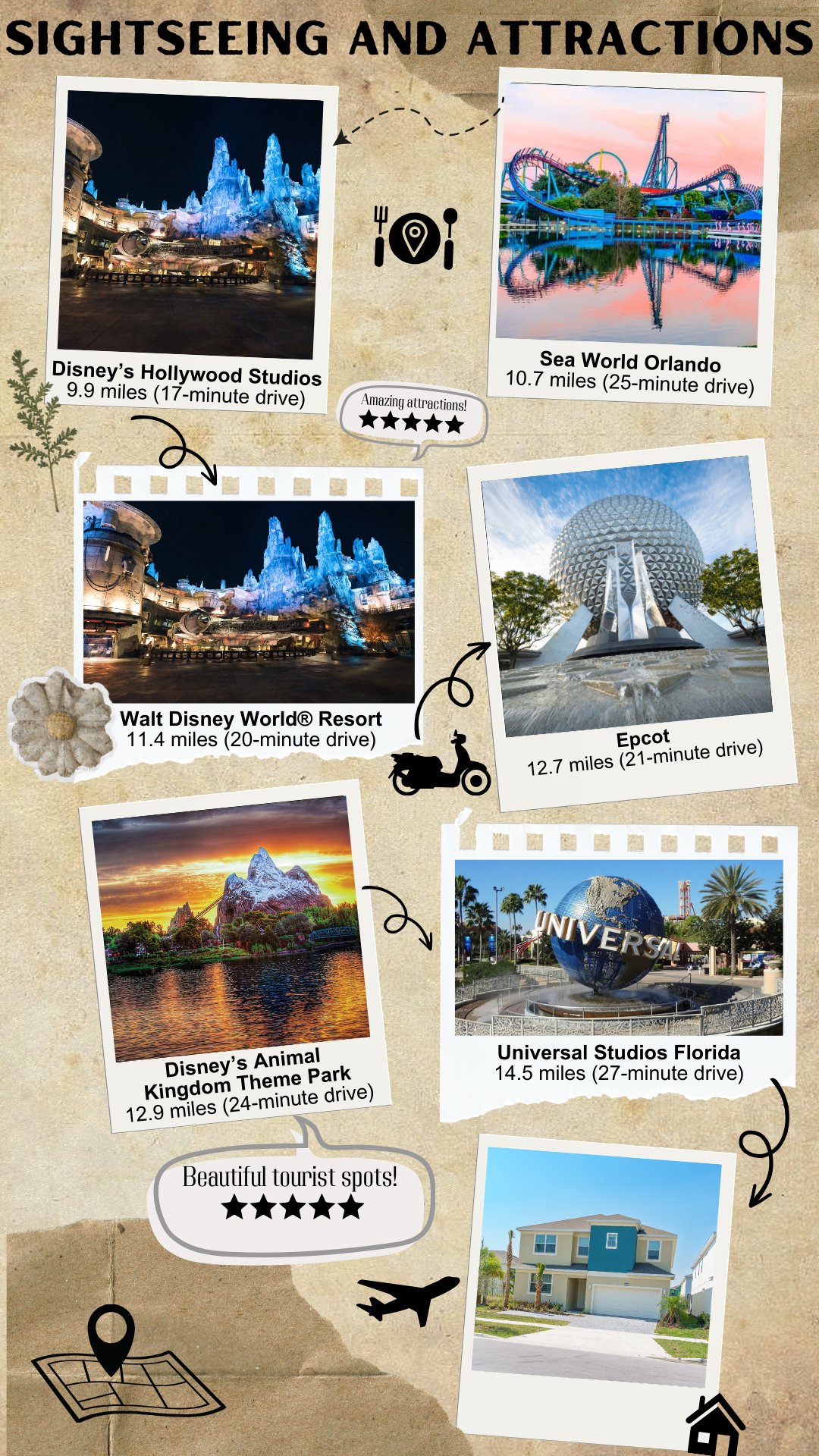 Get AroundParking is easy in the area, with free parking at several shopping malls. Walt Disney World is the main attraction! Supermarkets and shopping locations are also just a few minutes drive away from the house such as the Walmart Supercenter, Wawa, ALDI Food Market, Plaza Del Sol, Publix Food & Pharmacy, and Kissimmee Valley Livestock Shows Pavilion. There are also restaurants and bars accessible within less than 5 minutes to less than 15 minutes drive such as the Fish Taco Kissimmee, La Granja Kissimmee, Kabayan Grill Filipino Restaurant, Paul's Italian Deli and Restaurant, Abracadabra Ice Cream Factory, The Italian Joint, Buchito Cuban Style Breakfast, Pa' Paraguaná Venezuelan Latin Restaurant, Big John's Rockin' BBQ, Sazón Latino Mexican Restaurant, and Kobé Japanese Steakhouse.