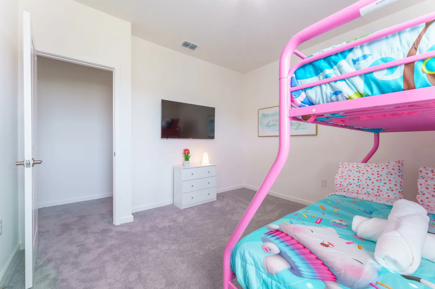 Welcome to stunning bedroom in shared home with pool! - Twin over full bunk bed - Bedroom & bathroom in a private corridor - Bathroom is shared with one other room - Smart 50" Roku TV & wardrobe - Shared kitchen, dining, laundry, game room, patio, pool - 17 min to Disney, 25 min to Universal Studios - Travel to parks by Uber, rented car, public bus - Free access to pool & gym at clubhouse - Self-check-in between 4 pm to 2am - Early check-in may be available for a fee - Long-term stays available